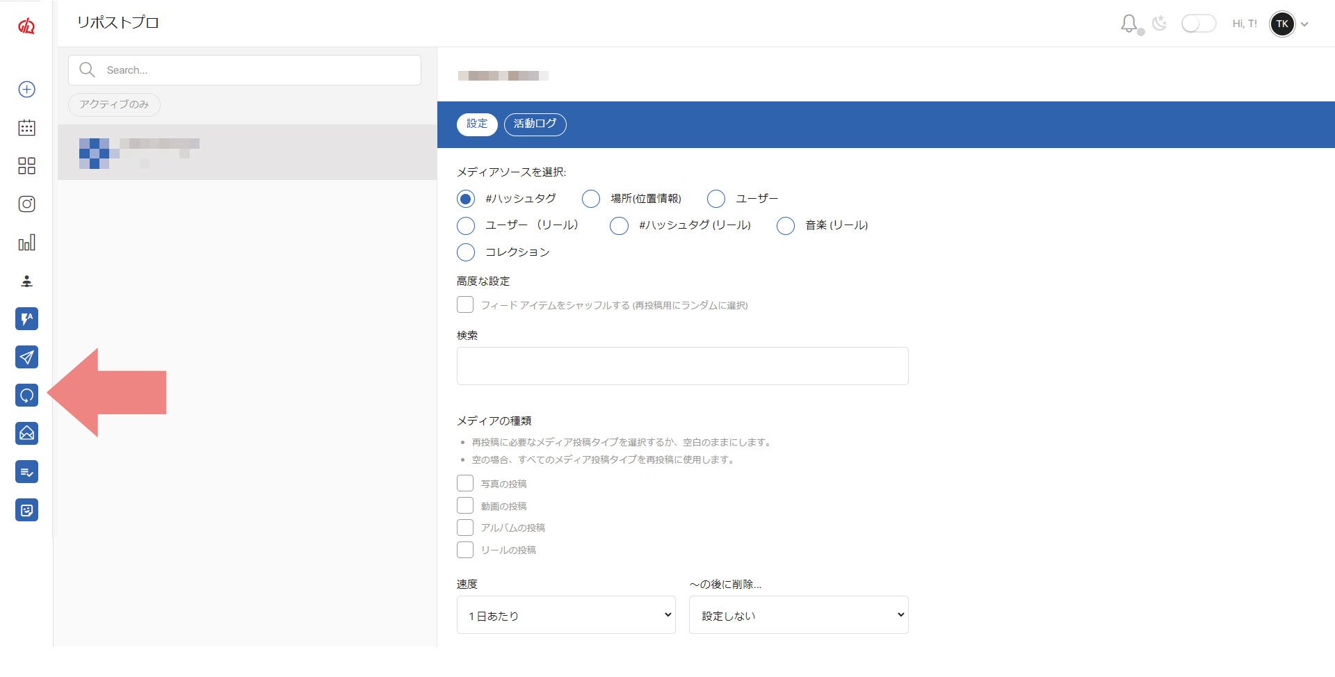 画面左メニューの上記のアイコンをクリックすると、リポスト機能の設定画面が開きます。