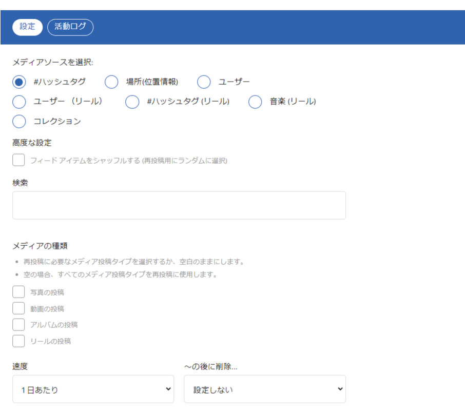 ・速度:1日に何回リポストを行うかの設定になります。